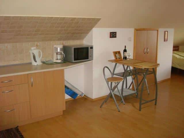 – W pełni wyposażona kuchnia na parterze: duża lodówka z zamrażarką, kuchenka gazowa z piekarnikiem, kuchenka mikrofalowa, czajniki elektryczne, toster, garnki, patelnie, sztućce, ekspres do kawy oraz zastawa stołowa. Dodatkowo, krzesełko do karmienia dzieci.