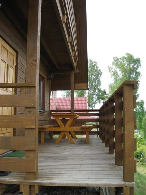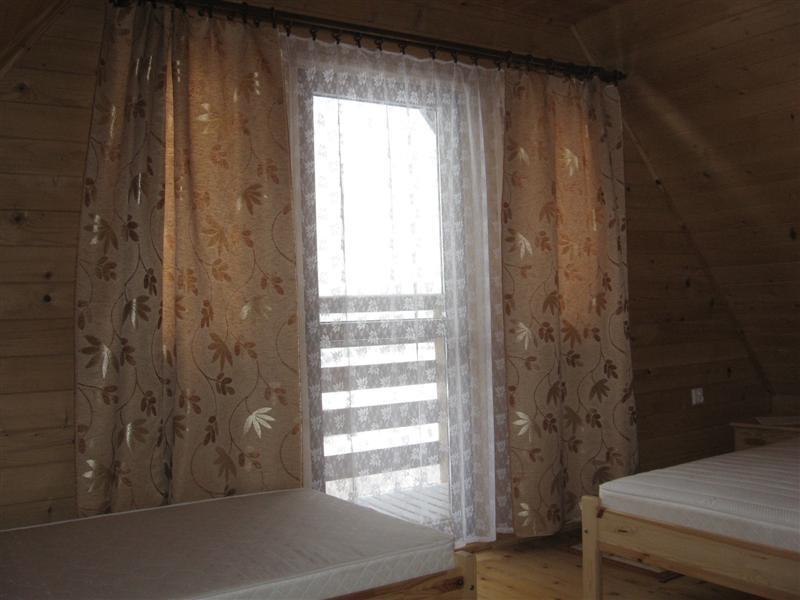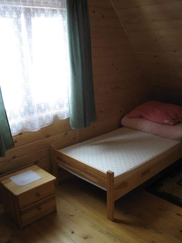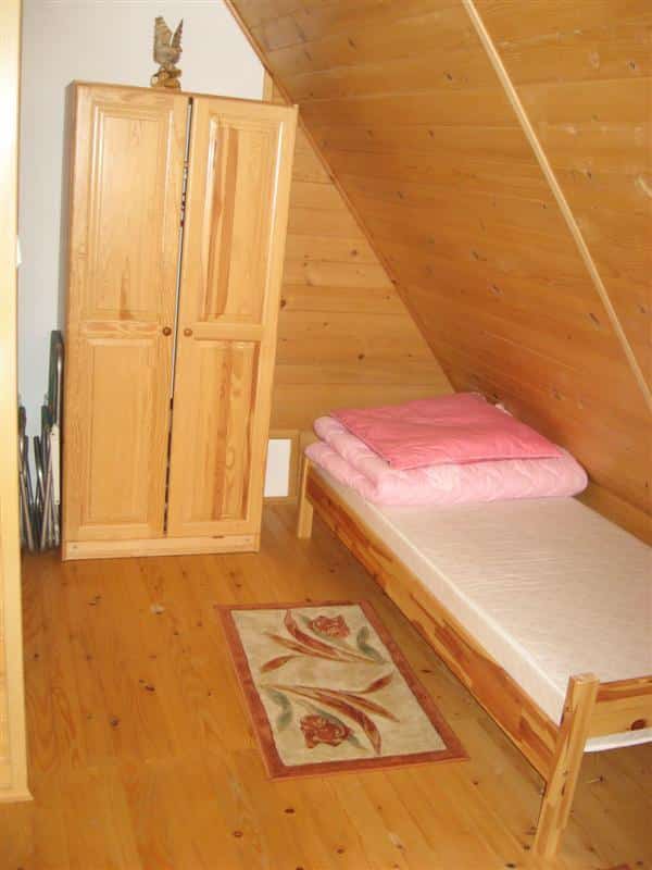 Na piętrze znajdują się dwie sypialnie: trzyosobowa i czteroosobowa z balkonem. Wyposażone w drewniane łóżka, szafy oraz lampki nocne, zapewniają spokojny sen. Drewniane podłogi z dywanikami dodają przytulności.