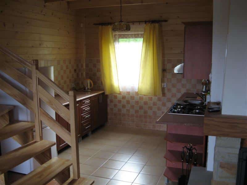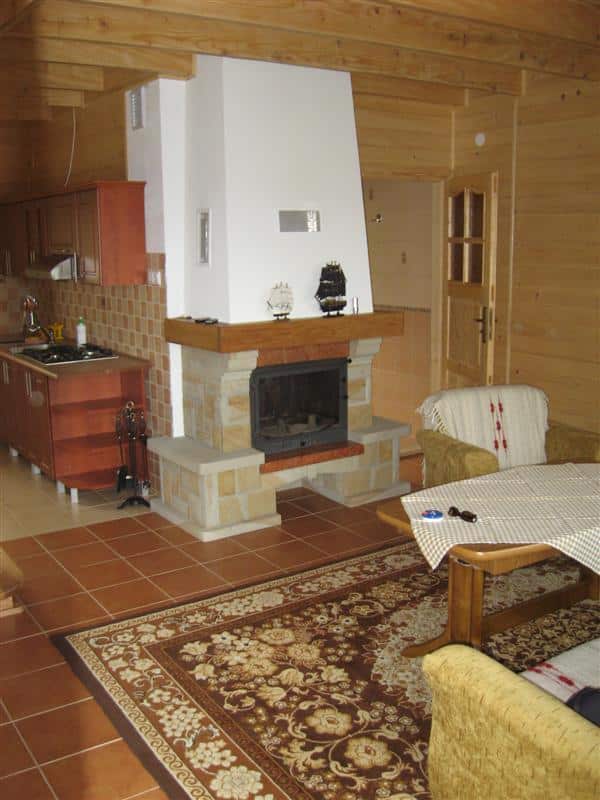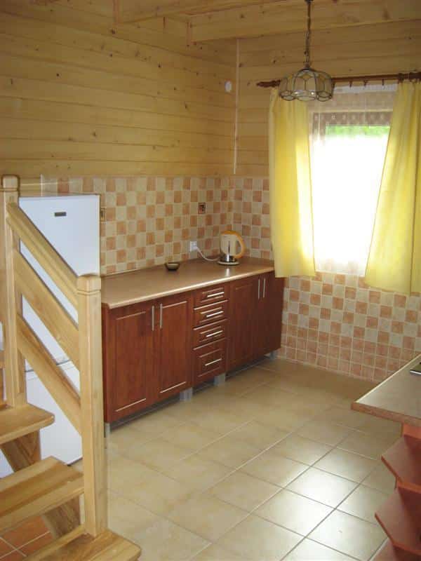 Nasz dwupoziomowy domek oferuje komfortowe warunki dla całej rodziny. Na parterze znajdziecie w pełni wyposażoną kuchnię z lodówką, kuchenką gazową, pełną zastawą stołową, czajnikiem elektrycznym oraz naczyniami i sztućcami. W łazience czeka na Was prysznic z ciepłą i zimną wodą, wc oraz umywalka. Salon to miejsce relaksu z wygodnym zestawem wypoczynkowym, rozkładaną wersalką dla dwóch osób, telewizorem i wieżą Hi-Fi. Klimatyczny kominek na drewno oraz taras z widokiem na okolicę dopełniają całości.