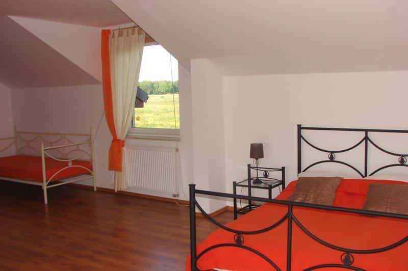 – **Domek letniskowy**: 70 m² z salonem, aneksem kuchennym, 2 sypialniami, 2 łazienkami, dla 6 osób.