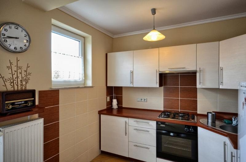 Na parterze domku znajduje się przestronny salon z kominkiem, który jest świetnym miejscem do odpoczynku i relaksu. Można tu również obejrzeć ulubione filmy na telewizorze LCD. Aneks kuchenny jest w pełni wyposażony, co umożliwia przygotowanie smacznych posiłków. Znajdują się w nim: