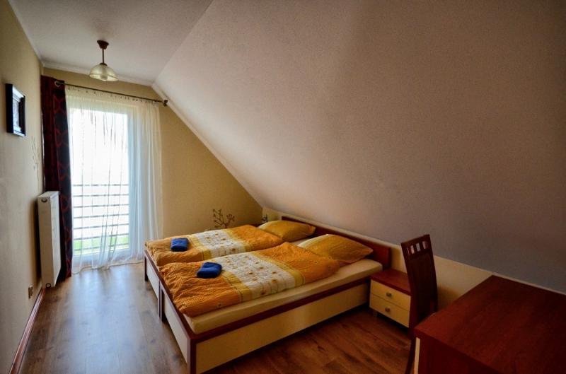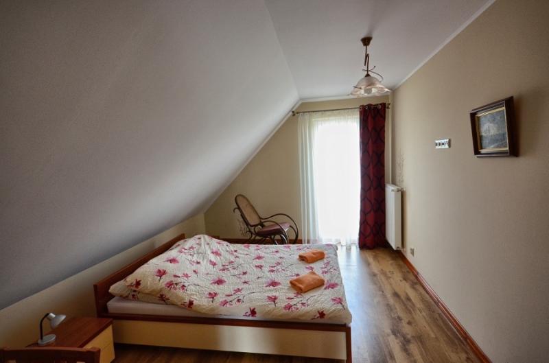 Na piętrze domku znajdą Państwo dwie przytulne sypialnie, idealne do relaksu po dniu pełnym aktywności. Dodatkowo, na piętrze znajduje się łazienka z wanną oraz garderoba, która pomieści wszystkie niezbędne rzeczy.