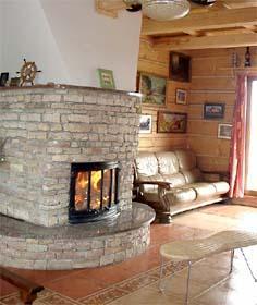 – Salon z kominkiem i tradycyjnym drewnianym wystrojem,