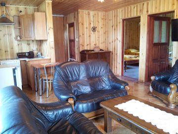 – W salonie: wygodne skórzane kanapy, telewizor oraz piec typu koza (A1) lub kominek (A2)