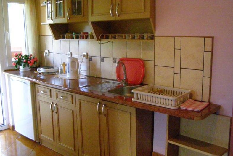 – w pełni wyposażoną kuchnię (lodówka, kuchenka elektryczna, czajnik bezprzewodowy, garnki, sztućce, talerze),