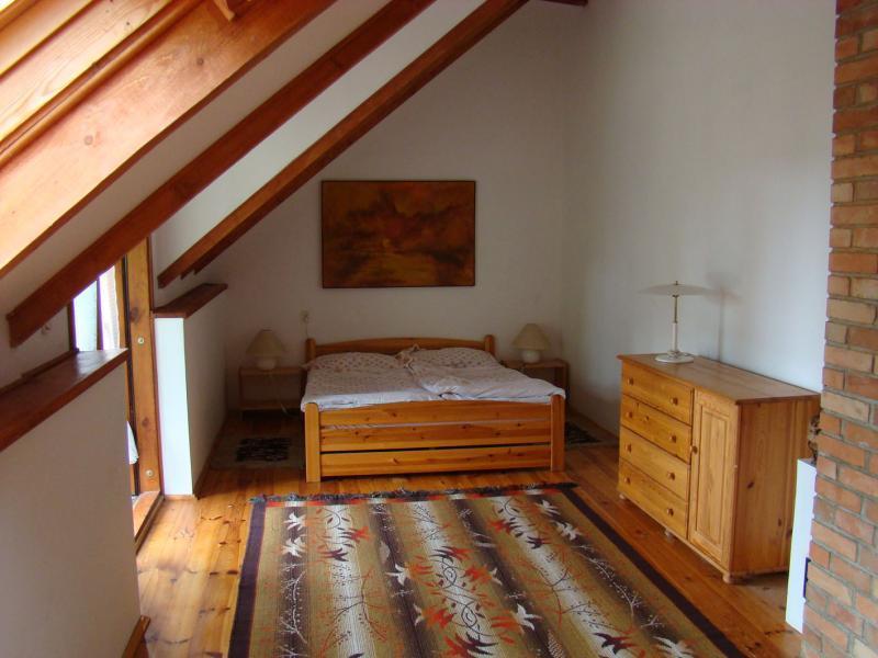 Na piętrze do dyspozycji gości jest salon z telewizją satelitarną oraz dwie sypialnie. Pierwsza sypialnia oferuje łóżko małżeńskie, szafę i komody, a także wyjście na taras z widokiem na jezioro Wulpińskie. Druga sypialnia jest wyposażona w biurko, krzesło i dwa łóżka jednoosobowe.