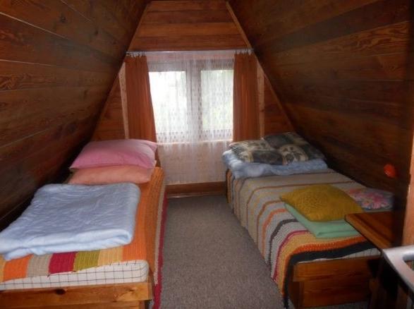 Domek, w pełni wykonany z drewna, oferuje komfortowe warunki dla maksymalnie 5 osób. Na parterze znajduje się przytulny salon z kominkiem, taras z widokiem na jezioro, w pełni wyposażona kuchnia oraz łazienka. Na piętrze czekają dwie sypialnie, gotowe na Twój przyjazd z kompletem pościeli i ręczników. Domek jest przyjazny dla zwierząt, więc możesz zabrać ze sobą swojego pupila. Centralne ogrzewanie zapewni Ci ciepło w chłodniejsze dni.