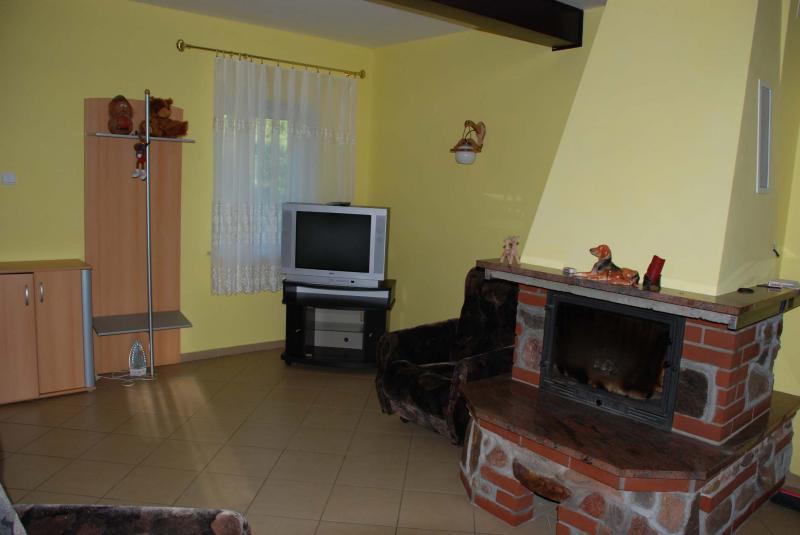 – Salon z kominkiem z żeliwnym wkładem.