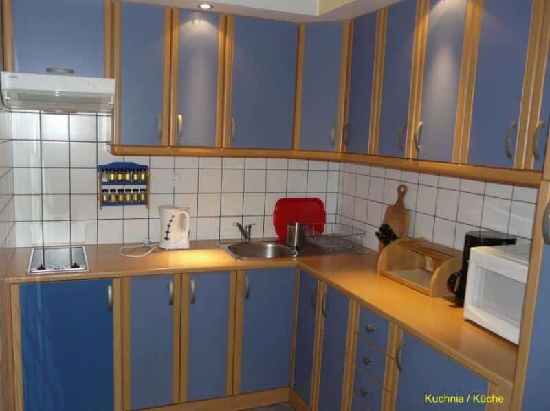 – Aneks kuchenny w pełni wyposażony w lodówkę, kuchenkę, czajnik elektryczny oraz komplet garnków i naczyń stołowych.
