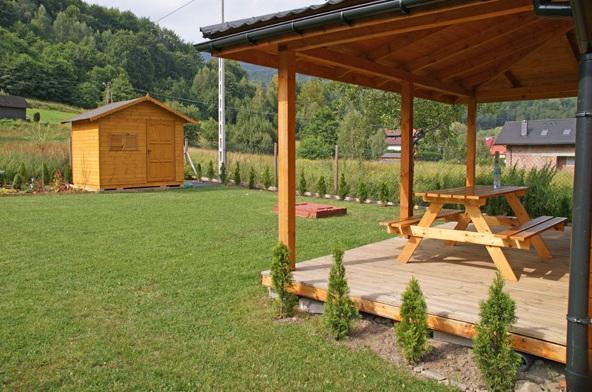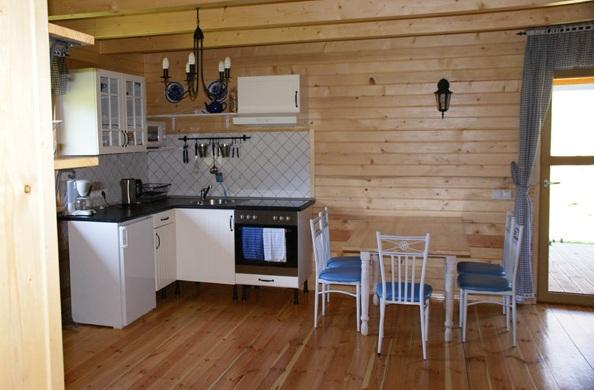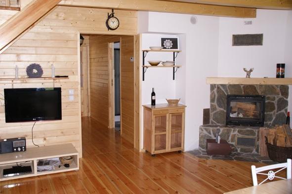 Na parterze znajduje się przestronny salon z kominkiem i w pełni wyposażonym aneksem kuchennym, gdzie można przenocować dodatkowe dwie osoby na rozkładanej rogówce. Domek posiada także dwa zadaszone tarasy, idealne do relaksu na świeżym powietrzu.