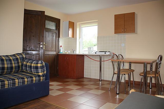 – W pełni wyposażony aneks kuchenny (kuchenka gazowa, lodówka, czajnik, przybory kuchenne)