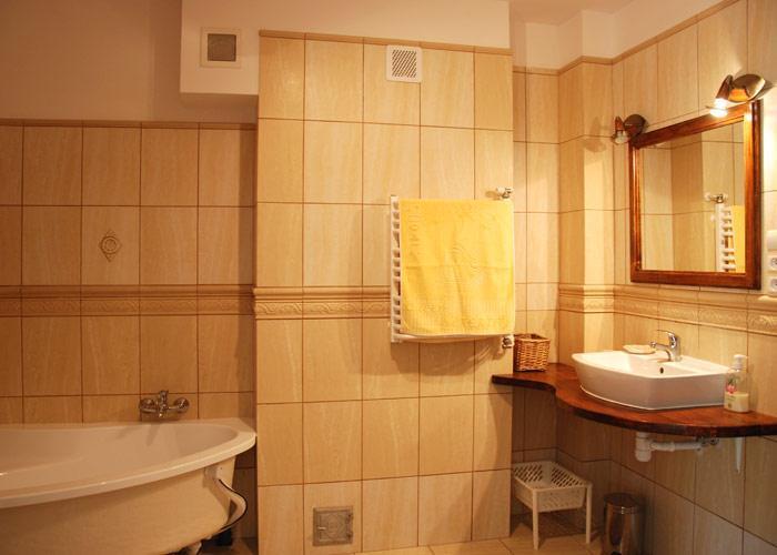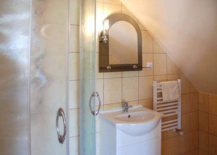 Dla naszych gości przygotowaliśmy komfortowe pokoje: na parterze oferujemy pokój dwuosobowy i trzyosobowy z możliwością dostawki. Znajduje się tam również łazienka z prysznicem, toaletą, umywalką i wanną. Na piętrze czeka na Państwa pokój dwuosobowy z łazienką i balkonem oraz pokój trzyosobowy z łazienką. Łazienki na piętrze wyposażone są w umywalkę, toaletę i prysznic.