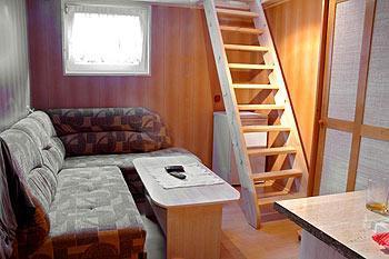 Domek jest murowany i wyposażony w centralne ogrzewanie, co zapewnia komfortowy pobyt przez cały rok. Wnętrze składa się z dwóch przytulnych pokoi oraz łazienki. Na górnym piętrze znajduje się pokój z dwoma pojedynczymi łóżkami oraz tarasem, gdzie można cieszyć się świeżym powietrzem i widokami. Parter oferuje drugi pokój z rozkładaną rogówką dla dwóch osób, aneks kuchenny z lodówką oraz telewizor, co sprawia, że pobyt jest wygodny i przyjemny. Łazienka jest wyposażona w toaletę, umywalkę, kabinę natryskową i bojler elektryczny.