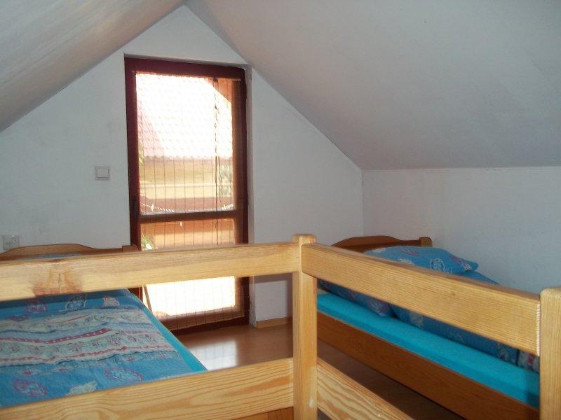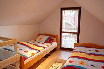 – Górny pokój: dwa pojedyncze łóżka, taras