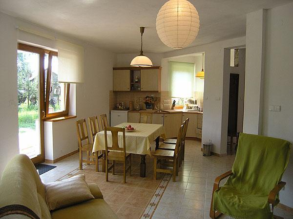 W środku czeka na Państwa starannie urządzone wnętrze, które zapewnia wygodę i spokojny wypoczynek. Na parterze znajduje się przestronny salon z kominkiem i telewizorem, idealny do spędzania miłych wieczorów w gronie rodziny lub przyjaciół. Nasza w pełni wyposażona kuchnia pozwala na samodzielne przygotowanie posiłków, a zewnętrzny taras to doskonałe miejsce na chwilę wytchnienia na świeżym powietrzu.