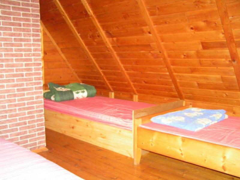 Na piętrze znajduje się sypialnia, która pomieści 4 osoby, z możliwością dostawienia dodatkowych 2 miejsc do spania. Dzięki temu, nasz domek jest idealny zarówno dla rodzin, jak i grup przyjaciół.