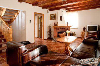 – Duży salon z wygodnymi meblami wypoczynkowymi, telewizorem, stołem z krzesłami, kominkiem oraz deską do prasowania i żelazkiem.