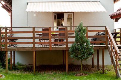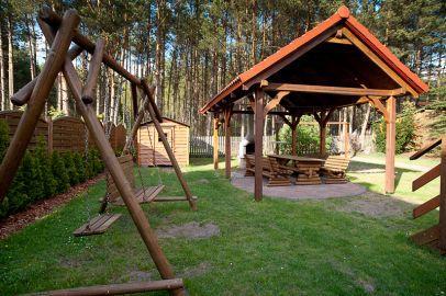 Z salonu można wyjść na taras, gdzie znajduje się drewniana altana z grillem i meblami ogrodowymi, huśtawka oraz domek do zabaw dla dzieci.