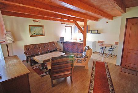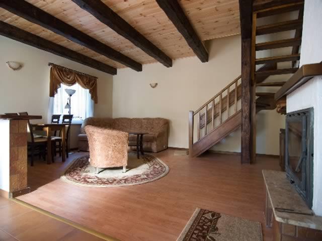 – Parter: salon z telewizorem i kominkiem, w pełni wyposażony aneks kuchenny oraz toaleta.
