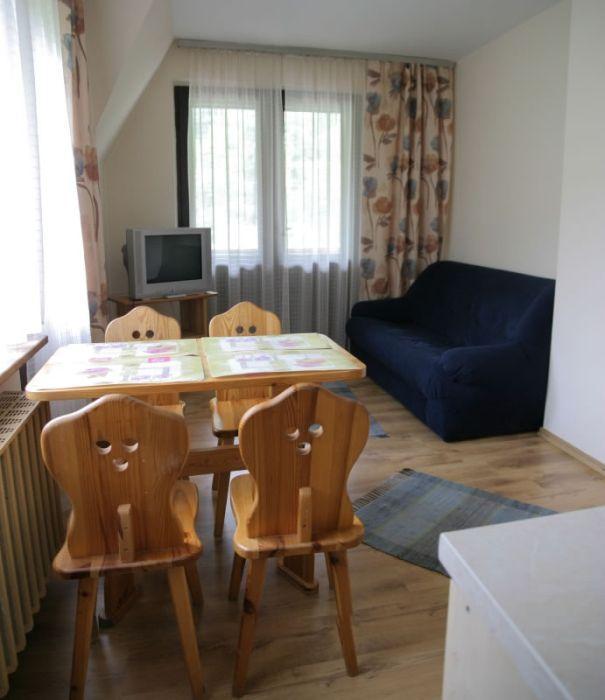 – Apartament 4-osobowy: idealny dla rodziny lub dwóch par, z dwiema sypialniami (jedna z łóżkiem małżeńskim, druga z dwoma pojedynczymi łóżkami), salonem z aneksem kuchennym, TV, łazienką, bezprzewodowym Internetem oraz przestronnym tarasem z widokiem na górę Hulina.