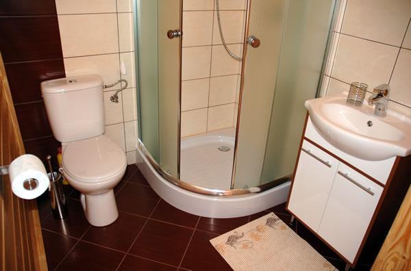 – **Łazienka**: z kabiną prysznicową, toaletą, umywalką i lustrem.