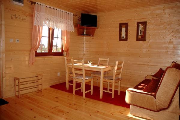 – **Pokój dzienny**: wyposażony w kanapę, stół z czterema krzesłami, telewizor oraz radio.