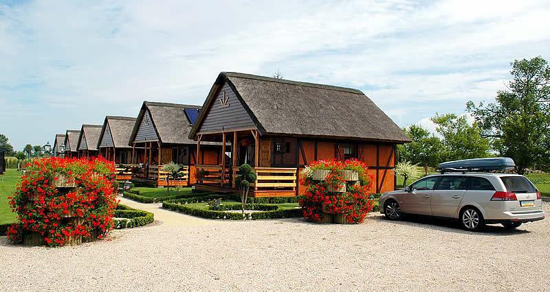 Nasze domki, inspirowane tradycyjną architekturą szachulcową, mają dachy kryte strzechą, co nadaje im wyjątkowy urok. Każdy z nich ma powierzchnię 36 m² i jest przeznaczony dla czterech osób. W środku znajdują się: