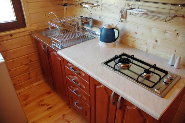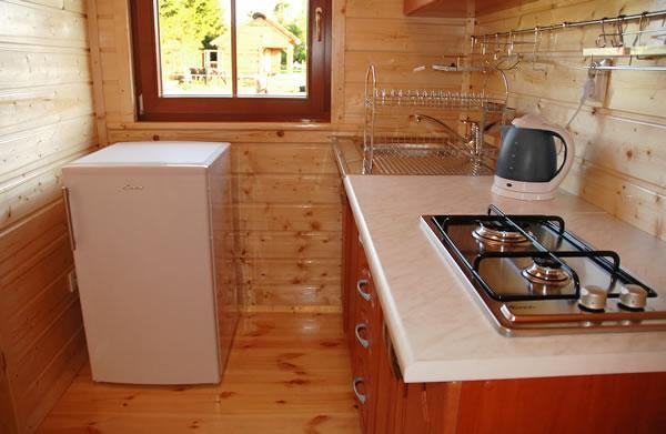 – **Aneks kuchenny**: z lodówką, kuchenką, zlewozmywakiem, szafkami z naczyniami oraz czajnikiem bezprzewodowym.