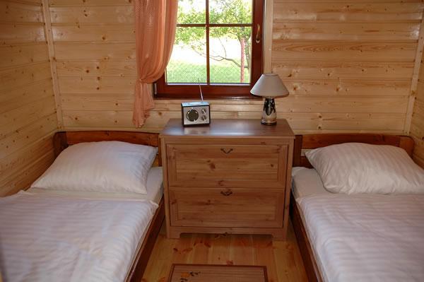 – **Dwie sypialnie**: jedna z dwuosobowym łóżkiem i szafą, druga z dwoma pojedynczymi łóżkami i komodą.