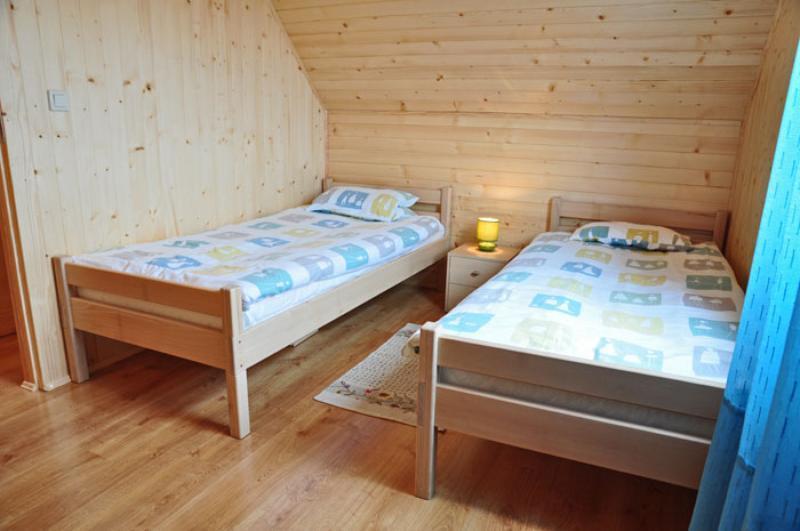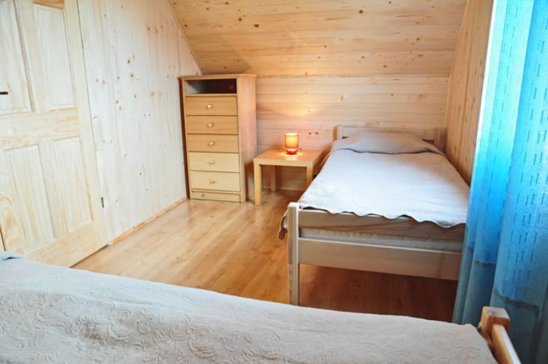 Na piętrze znajdują się dwie sypialnie. W jednej z nich są dwa pojedyncze łóżka, a w drugiej łóżko podwójne i pojedyncze. Dodatkowo między sypialniami znajduje się toaleta, co zwiększa wygodę pobytu.