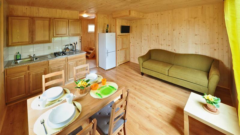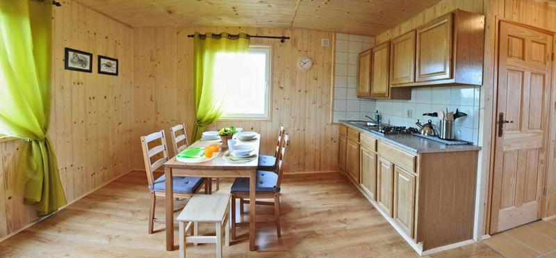 Wyposażenie domków i ośrodka obejmuje: