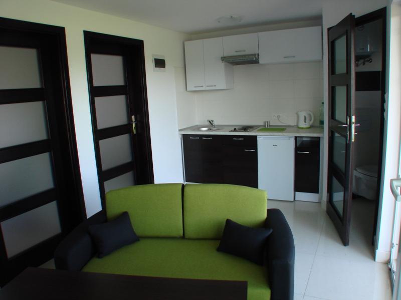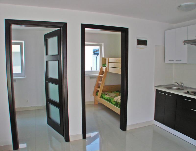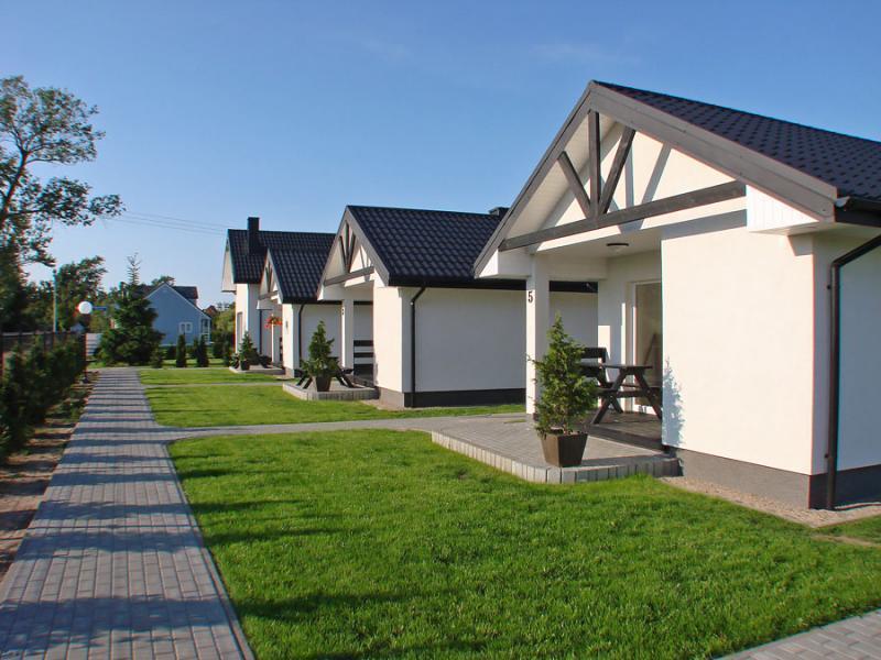 Oferujemy sześć nowoczesnych, murowanych domków, które mogą pomieścić cztery lub pięć osób. Każdy domek składa się z części dziennej z sofą, ławą i telewizorem LCD, aneksu kuchennego z pełnym wyposażeniem, dwóch sypialni z wygodnymi łóżkami oraz łazienki. Każdy domek posiada taras z drewnianym stołem, ławami i grillem. Dodatkowo, w domkach znajdziesz suszarkę na pranie, parawan i koc plażowy. Oferujemy również bezprzewodowy internet.