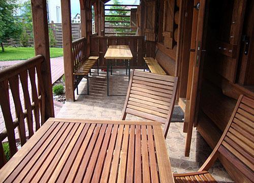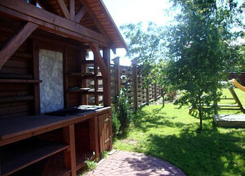 Przy każdym domku znajduje się taras wypoczynkowy, idealny do spędzania czasu na świeżym powietrzu.
