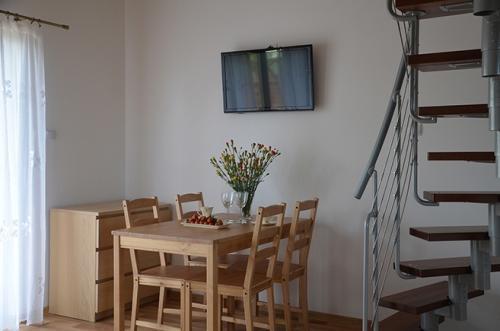 – Miejsca do spania: dwa łóżka jednoosobowe, jedno łóżko dwuosobowe na piętrze oraz dwuosobowa kanapa w salonie.