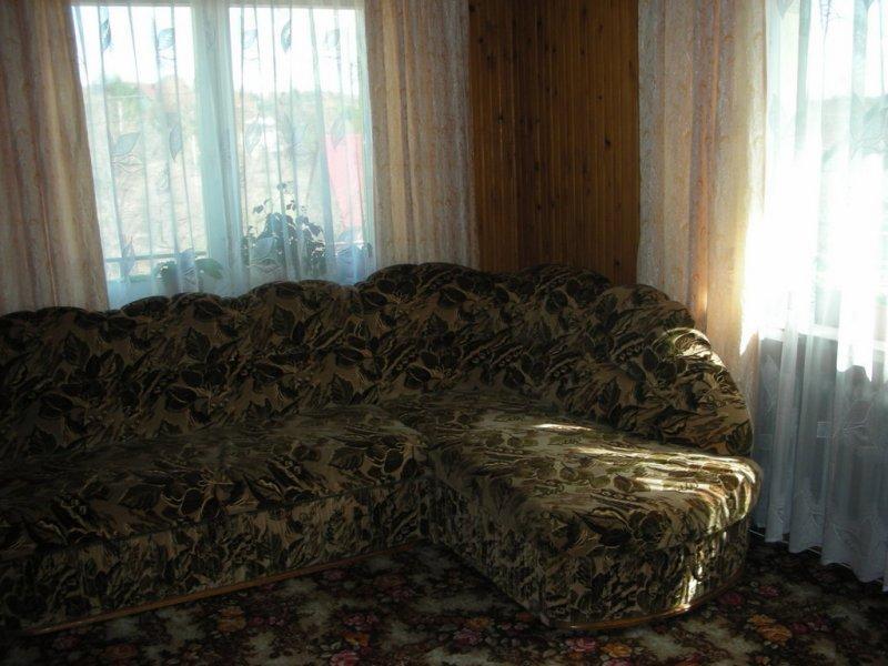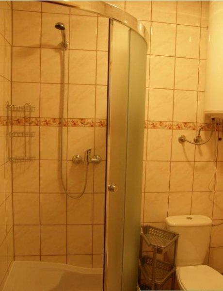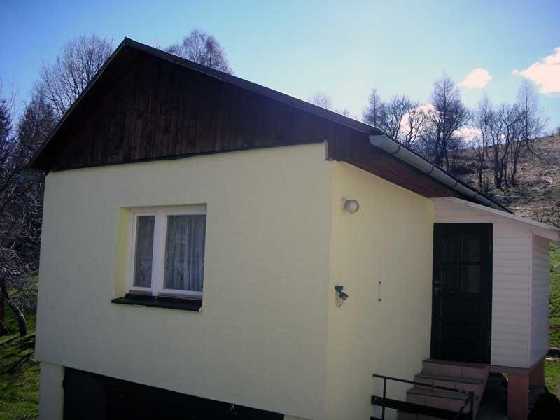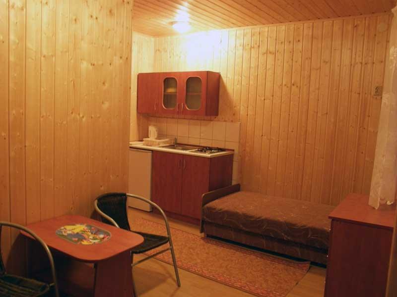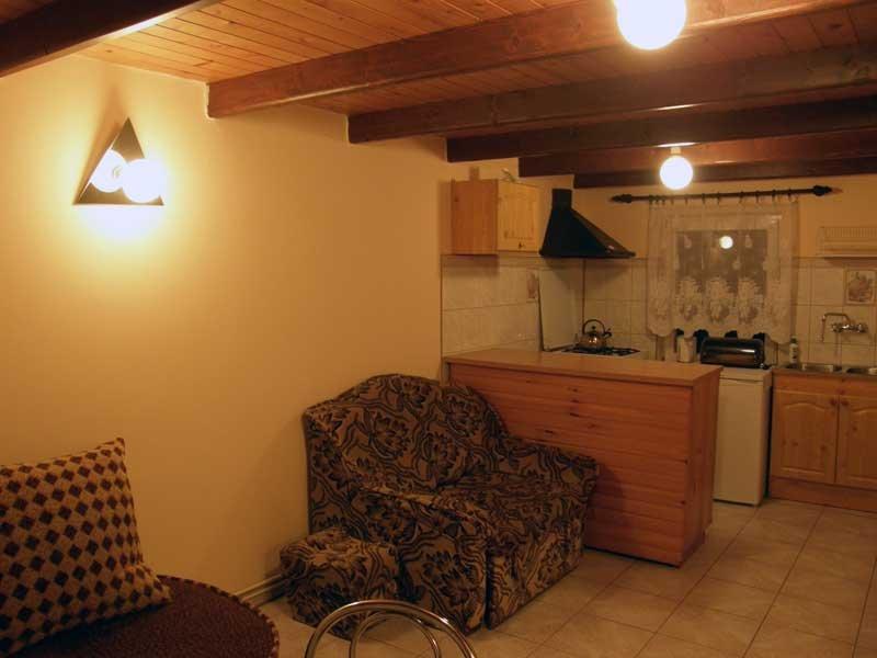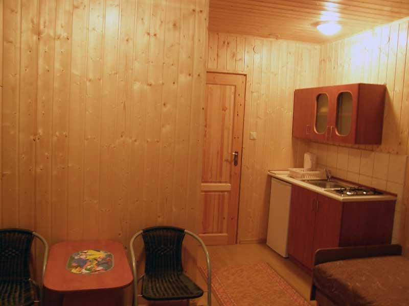 – **Domek murowany** również dla 5 osób. Składa się z salonu, w pełni wyposażonego aneksu kuchennego oraz łazienki. W domku znajduje się telewizor i lodówka.