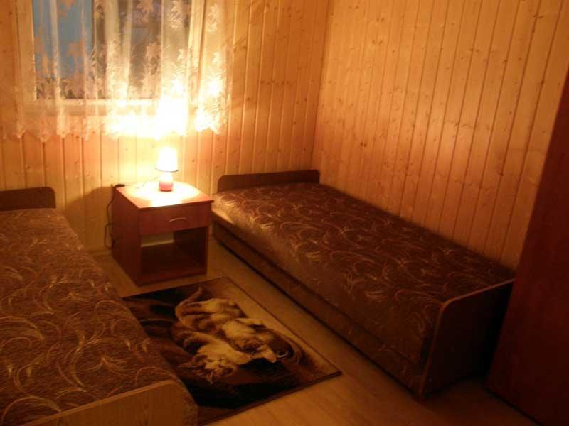 – **Dwa przytulne domki drewniane** dla maksymalnie 5 osób. Każdy domek wyposażony jest w osobną sypialnię, łazienkę, salon oraz w pełni wyposażony aneks kuchenny. Dodatkowo, w domkach znajdują się telewizor i lodówka.