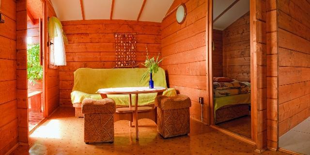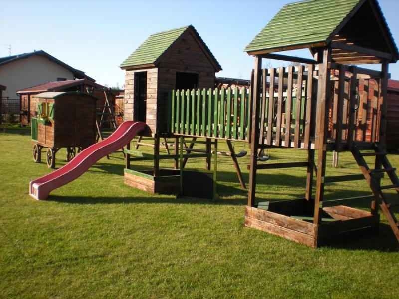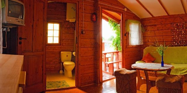 Na przestronnej działce o powierzchni 3000 m² oferujemy osiem czteroosobowych domków. Każdy z nich, o powierzchni 28 m², wyposażony jest w: