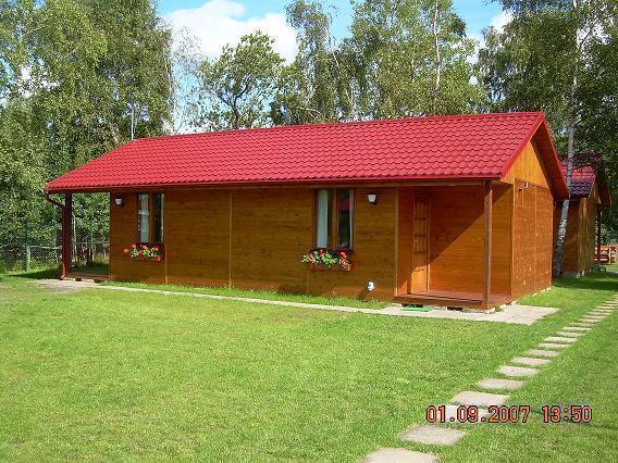 Zapraszamy do naszych drewnianych domków letniskowych, idealnych dla 4-6 osób. Każdy domek ma 36m² i składa się z dwóch sypialni, salonu z aneksem kuchennym oraz łazienki. Przed domkiem znajduje się drewniany zestaw wypoczynkowy: stół, dwie ławki oraz grill.