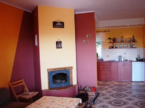 – Przestronnego salonu z kominkiem, dwuosobową kanapą i telewizorem,