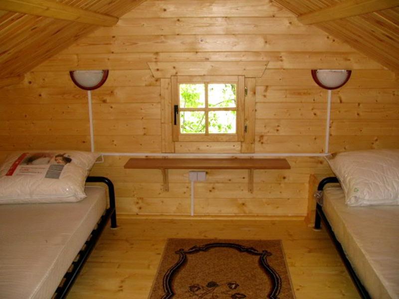 Oferujemy zakwaterowanie w pięciu komfortowych domkach campingowych, które pomieszczą 4 lub 6 osób. Każdy domek wyposażony jest w dwa pokoje, aneks kuchenny, łazienkę oraz antresolę. Na miejscu dostępne są również opcje wyżywienia – od śniadań po obiady i kolacje. Dla tych, którzy wolą gotować samodzielnie, przygotowaliśmy osobny budynek z w pełni wyposażoną kuchnią.