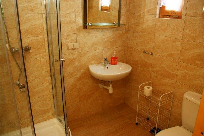– Łazienka na parterze z kabiną prysznicową, WC i umywalką