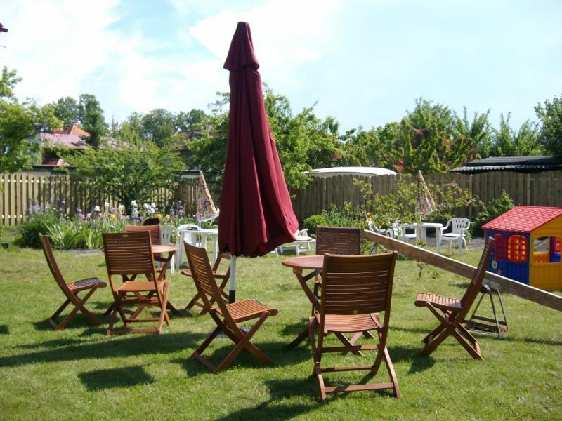 Przed domkami znajduje się przestrzeń do wypoczynku, idealna zarówno dla dzieci, jak i dorosłych.