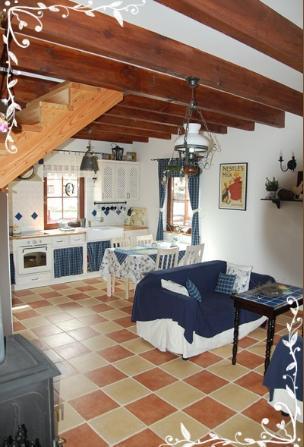 – Parter: salon z żeliwnym piecem na drewno, wyposażoną kuchnię i łazienkę z kabiną prysznicową.