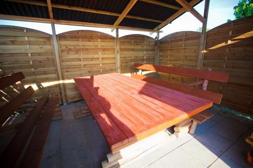 – Zadaszona altana ze stołem i ławą, idealna do grillowania.