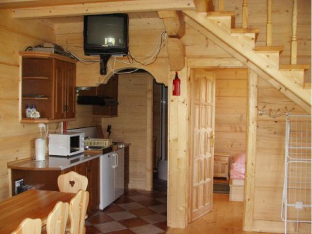 – W pełni wyposażoną kuchnię (kuchenka elektryczna, mikrofalówka, czajnik, lodówka, naczynia, sztućce)