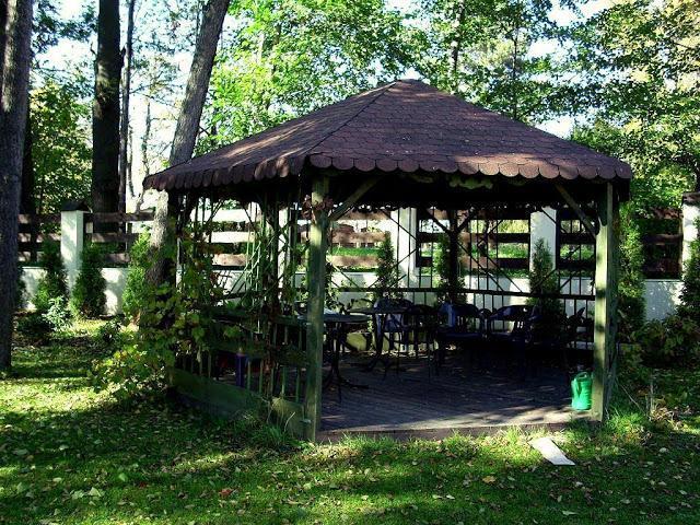 – Duża altana z huśtawką w ogrodzie