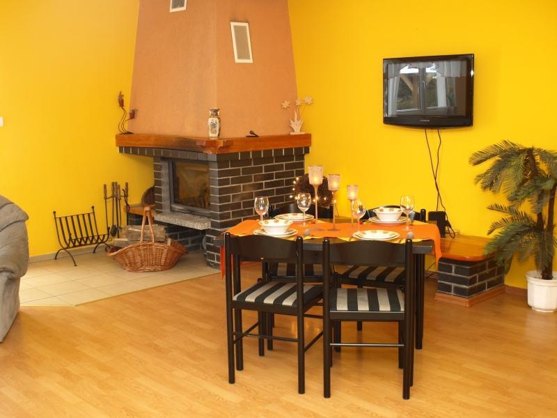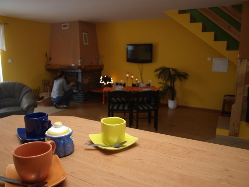 Salon gościnny z kominkiem i telewizorem zapewnia przytulne miejsce do relaksu i spędzania czasu w gronie bliskich. Dodatkowo, zapewniamy możliwość korzystania z bezprzewodowego Internetu, aby nasi goście mogli być zawsze podłączeni.