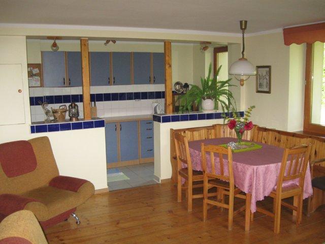 – Parter domu (80 m²): pokój trzyosobowy z łazienką, pokój czteroosobowy z łazienką, kuchnia z jadalnią oraz salon wypoczynkowy.