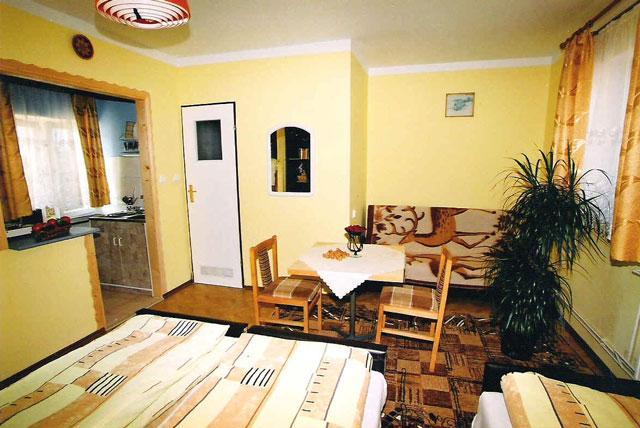 Oferujemy komfortowe zakwaterowanie w dwóch apartamentach dla 4-5 osób oraz drewnianym domku całorocznym dla 6 osób. Wszystkie opcje są w pełni wyposażone, posiadają aneks kuchenny, łazienkę i telewizor. Na terenie obiektu znajduje się także duży parking.