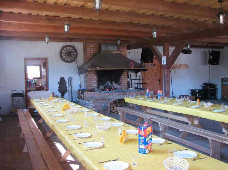 Do dyspozycji gości jest przestronne pomieszczenie z paleniskiem i kuchnią o imponującej powierzchni 120 m². Na terenie obiektu znajduje się także ogromny taras z miejscem do grillowania, idealny na letnie wieczory.